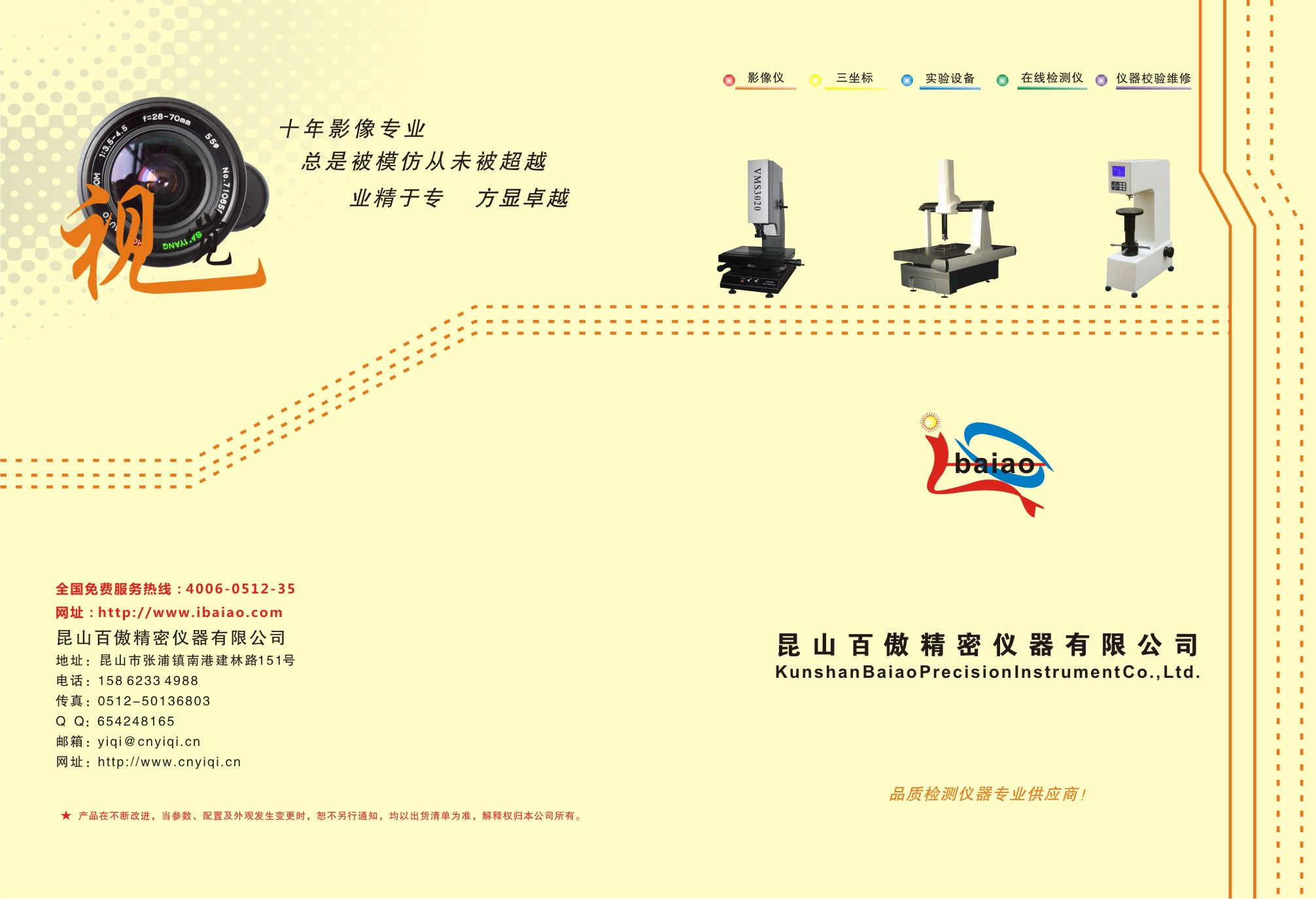 百傲仪器企业宣传册 发布时间:2015-06-23 14:37 作者:百傲 来源:未知 点击: 字号:大中小 昆山百傲精密仪器有限公司宣传册。 分享到: QQ空间 新浪微博 腾讯微博 人人网 微信 朋友网 更多 上一篇:提升影像测量仪的品质是企业立足之根本 下一篇:没有了